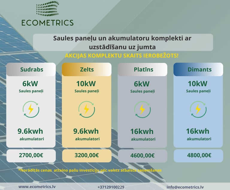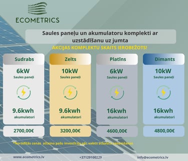 Dažādu jaudu saules paneļu un akumulatoru komplekti, atbilstoši elektroenerģijas patēriņam.
