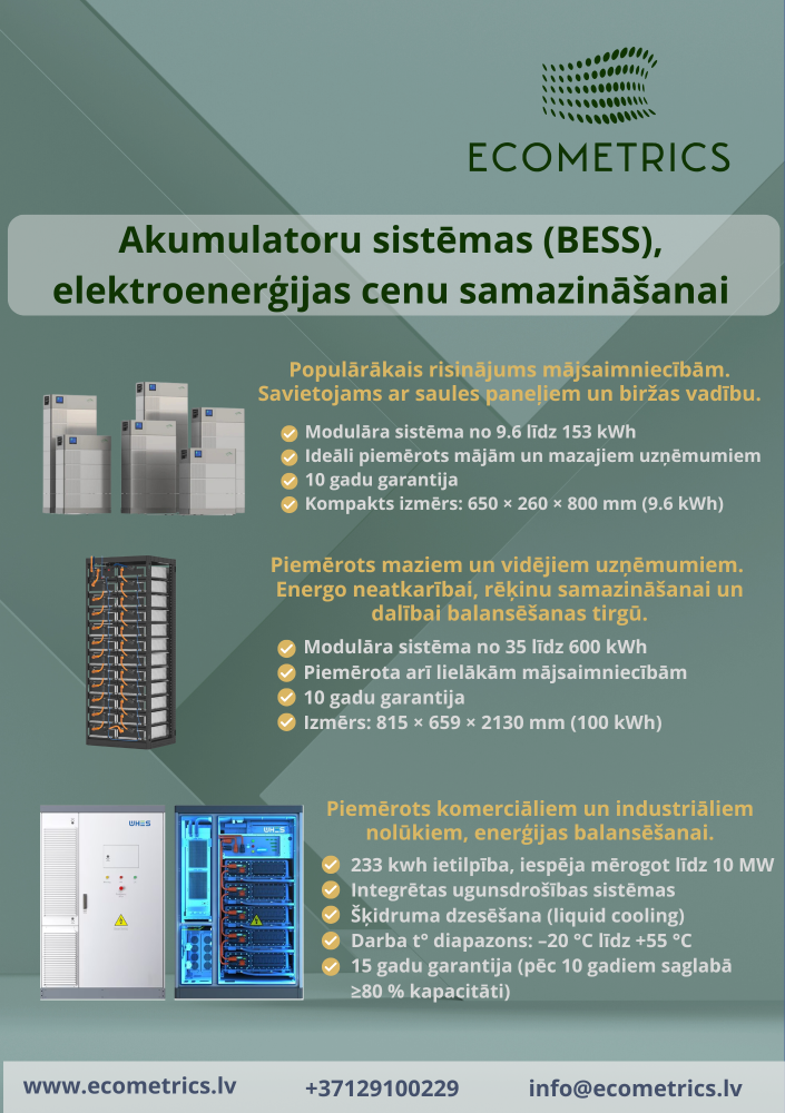 Mazo/vidējo uzņēmumu objektiem: 35–600 kWh, 10 g. garantija.